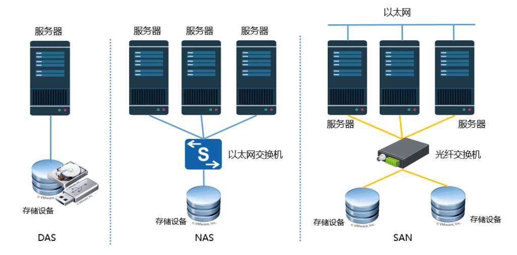 直接連接:透過SCSI、SATA、USB等介面直接連接到伺服器區塊