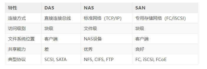 DAS適合簡單、低成本、高效能的單一伺服器場景NAS提供簡單易用、成本效益高的檔案共享解決方案SAN滿足企業級高效能、高可用的區塊儲存需求在協定選擇上,需要根據具體的作業系統環境、安全要求和效能需求做出合適的選擇。
