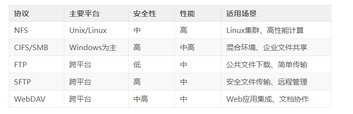 (3)優勢:Unix/Linux原生支援簡單輕量經過長期驗證的穩定性良好的效能表現(4)限制:Windows支援有限安全性相對較弱(NFSv4有所改善)